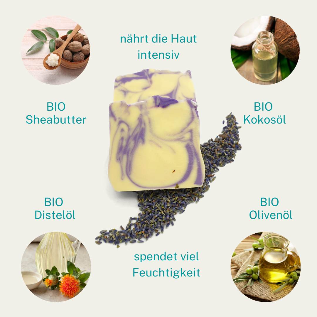 Sole-Seifen wie diese mit entspannendem Lavendelduft sind sehr gut vor allem für die anspruchsvolle Gesichtshaut