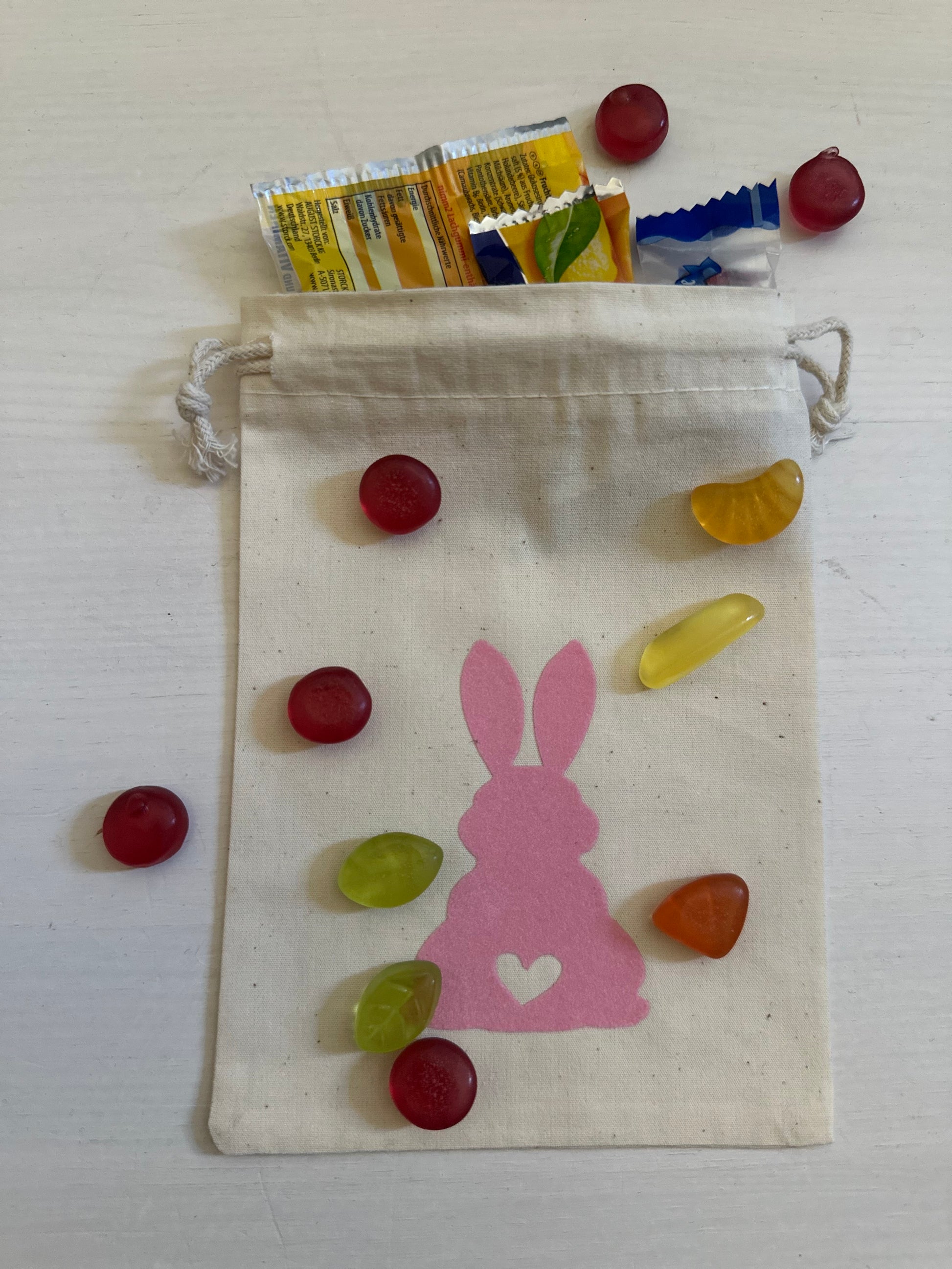Kleiner Süßer Beutel mit Zugband zum verschenken an Ostern mit ganz vielen Süßigkeiten darin. 🐰🐣