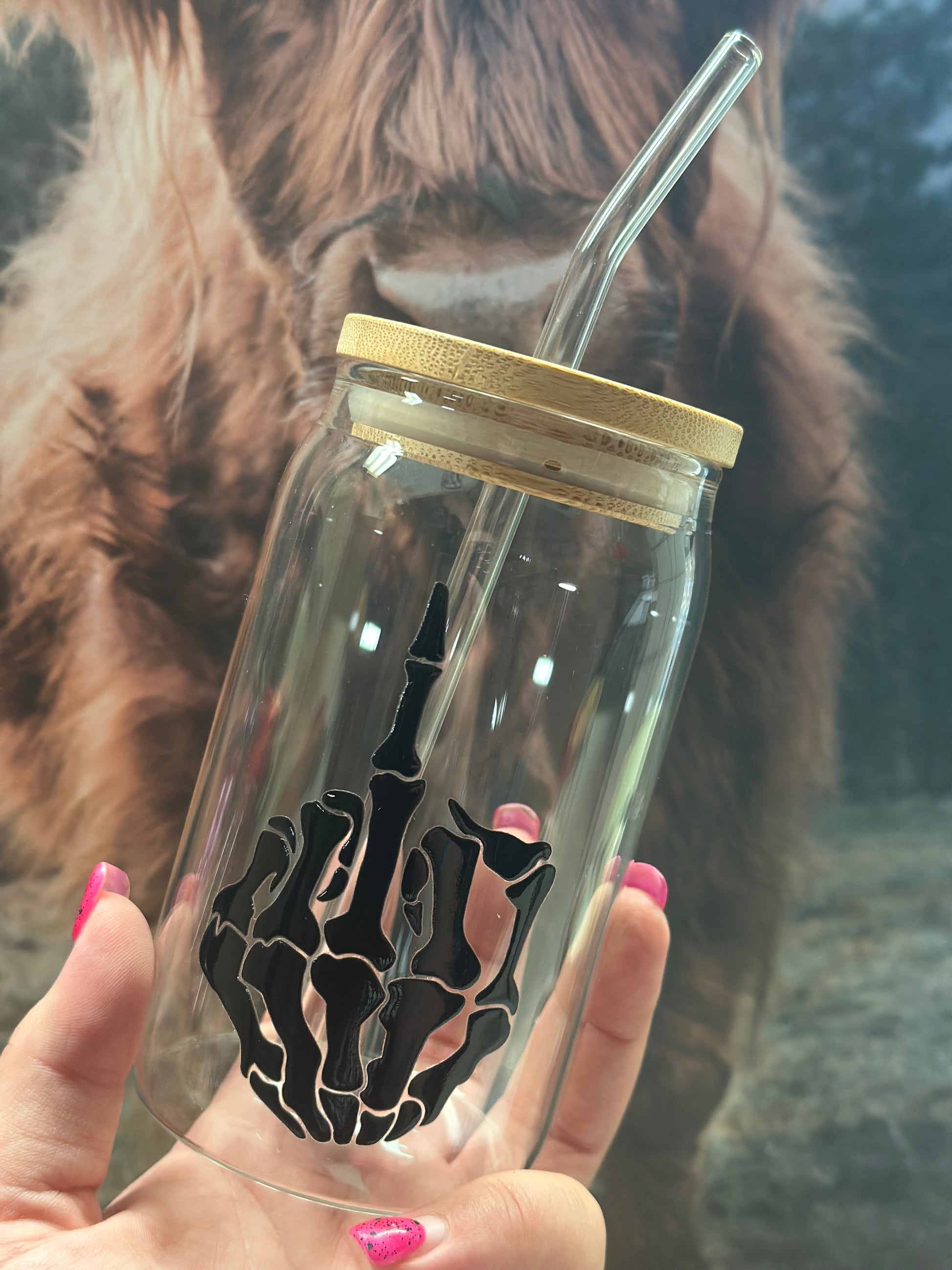 Trinkglas mit Bambusdeckel „Mittelfinger“